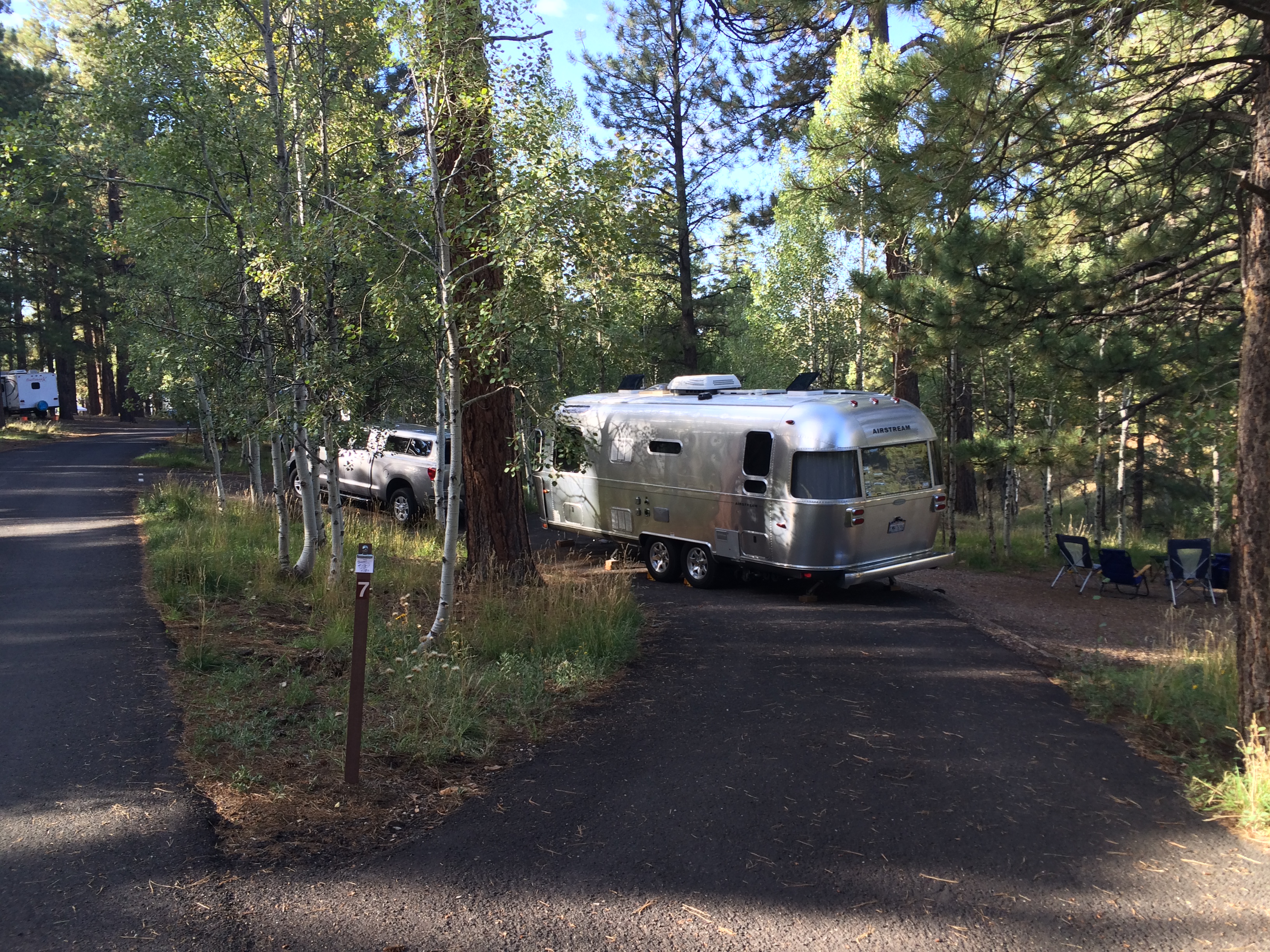 We haven’t been here in a long time and having only stayed in cabins on previous visits, the campground was new to us. We found a beautiful, quiet, spacious campground with all sites “pull-around” configuration. The “pull-around” was around trees! Nice paved sites, except almost all were “bowl” shaped and sloping to the one side – hard to see in the reservation photos. That meant it was a bit of a challenge to get situated and to arrange blocking – LEGO expertise was needed.
